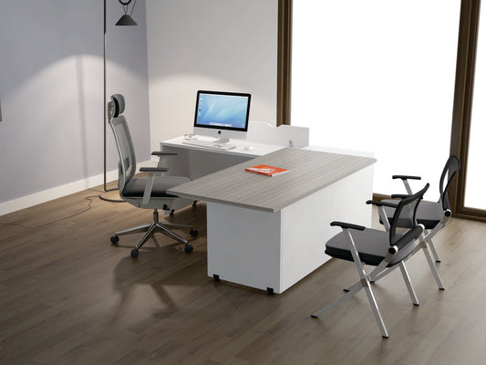 Escritorios con lateral con opciones de acabado en soportes y cubiertas, tamaños de escritorio adaptables a cualquier espacio.