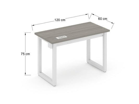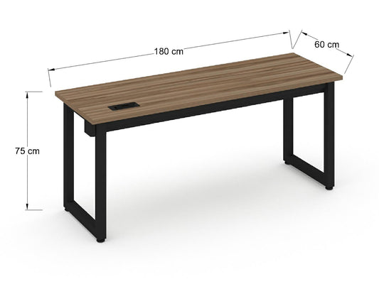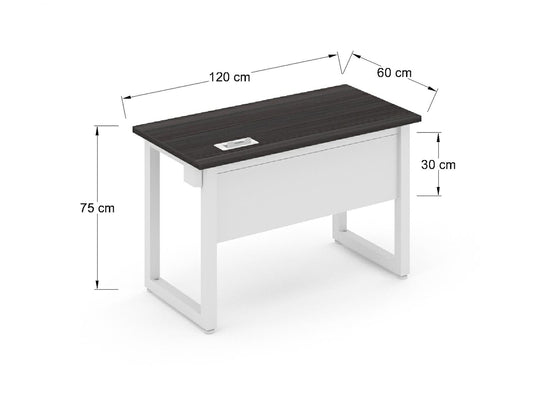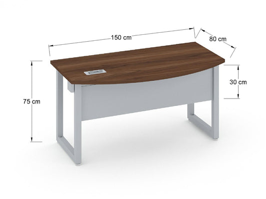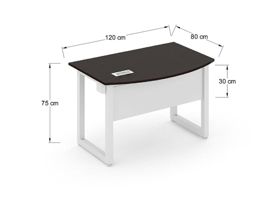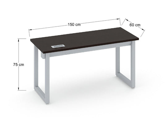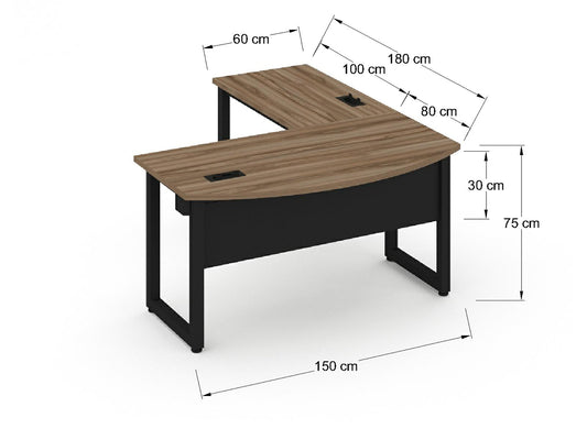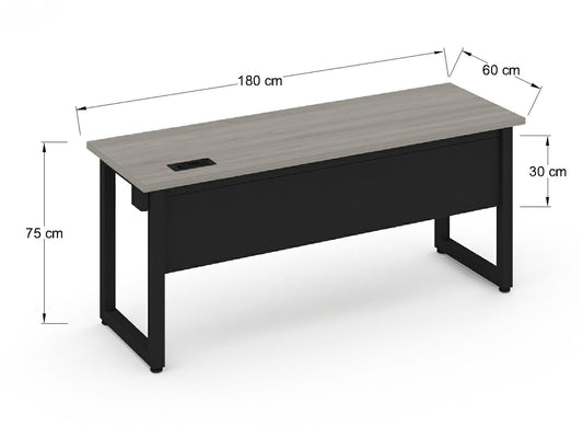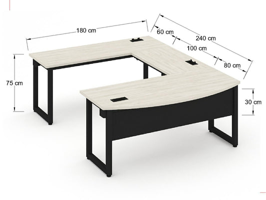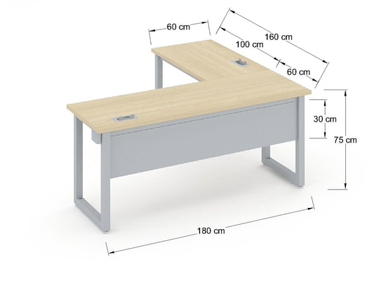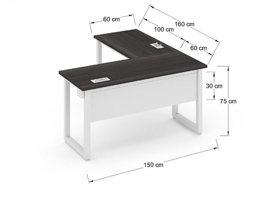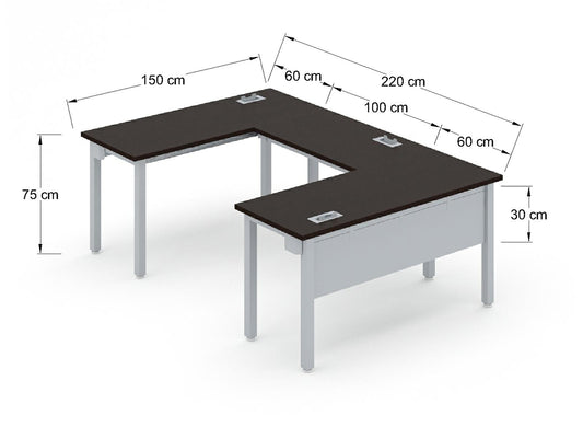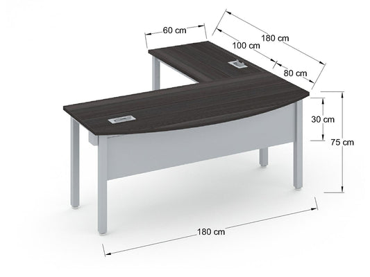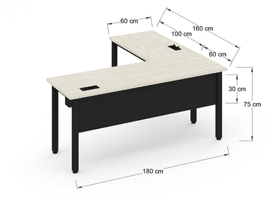 Cubiertas de laminado plástico (melamina) de 28mm, con pasa cables metálico abatible al color del chasis.