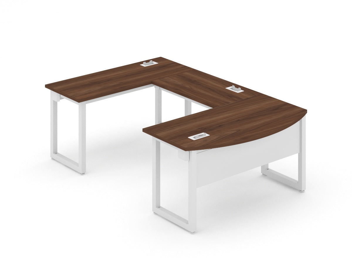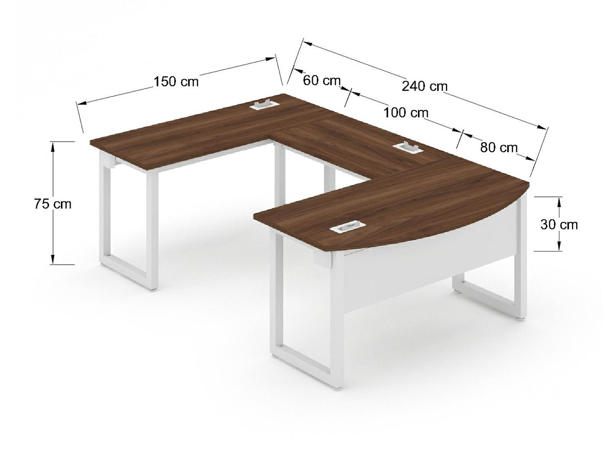 Modulo ejecutivo curvo cubiertas de 150x80 y lateral de 80x60 en 28mm de espesor, base metalica en forma de marco con trabe pasacables incluido el escritorio frontal.