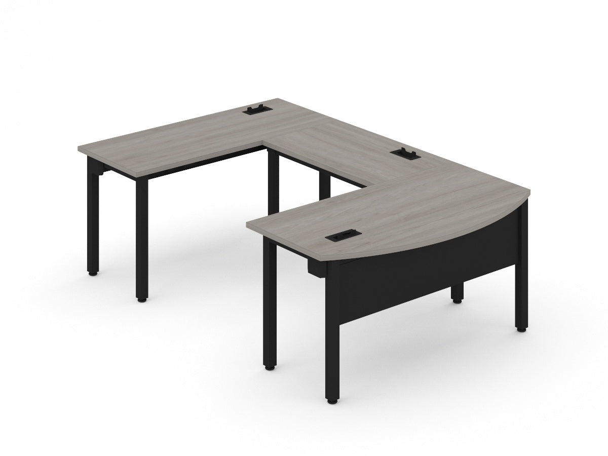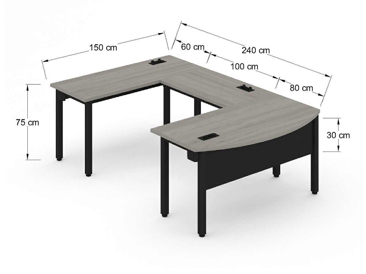 Modulo ejecutivo curvo cubiertas de 150x80 y lateral de 80x60 en 28mm de espesor, base metalica en forma de grapa con trabe pasacables incluido el escritorio frontal.