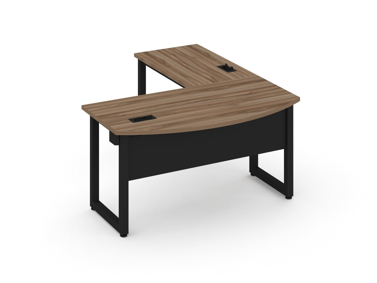 Escritorio individual curvo con lateral de 150x180cm en 28mm, base metalica en forma de marco con trabe pasacables incluido.