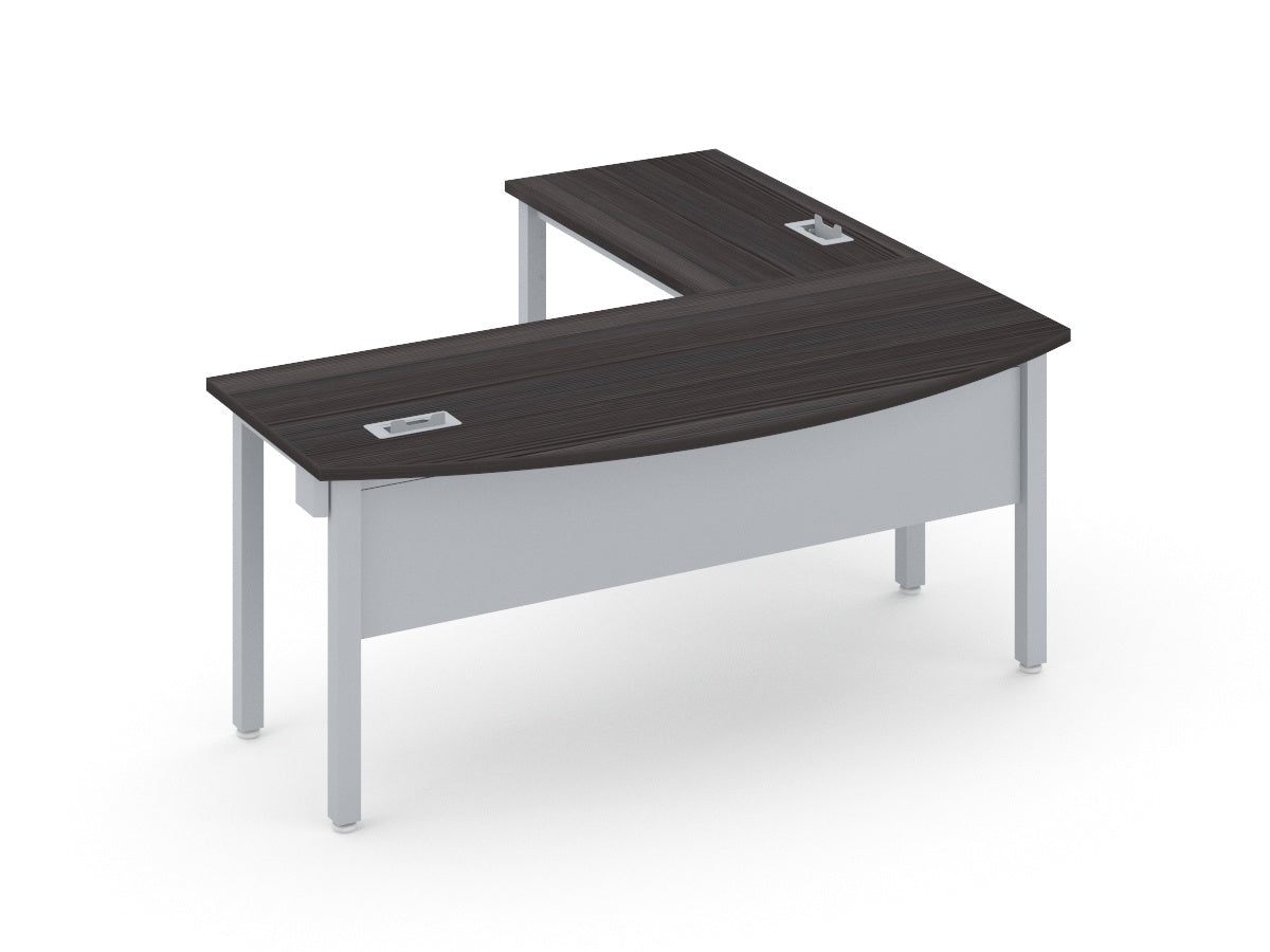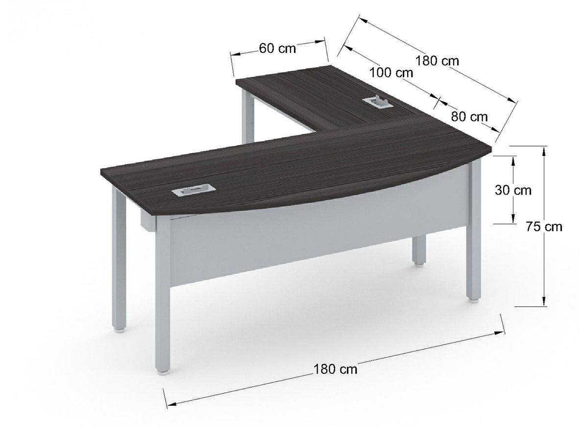 Escritorio individual curvo con lateral de 180x180cm en 28mm, base metalica en forma de grapa con trabe pasacables incluido.