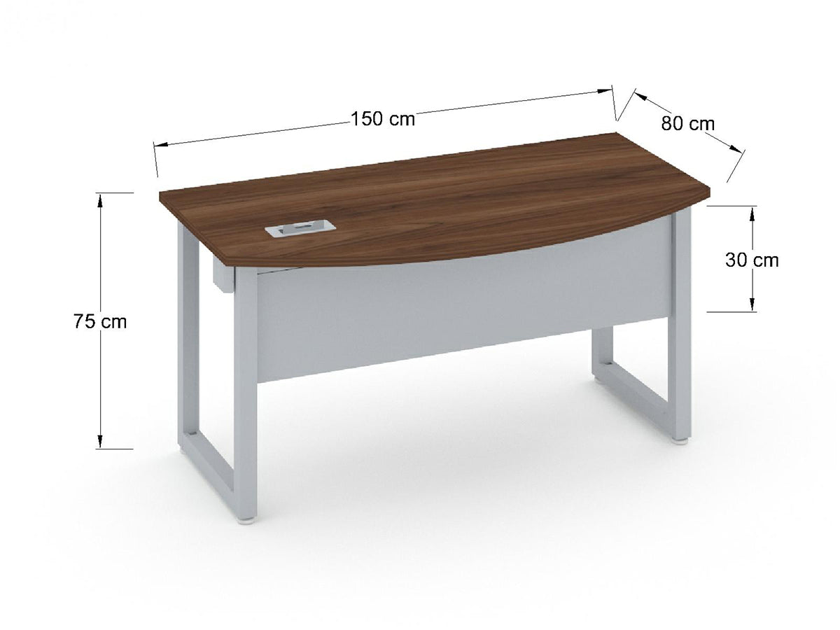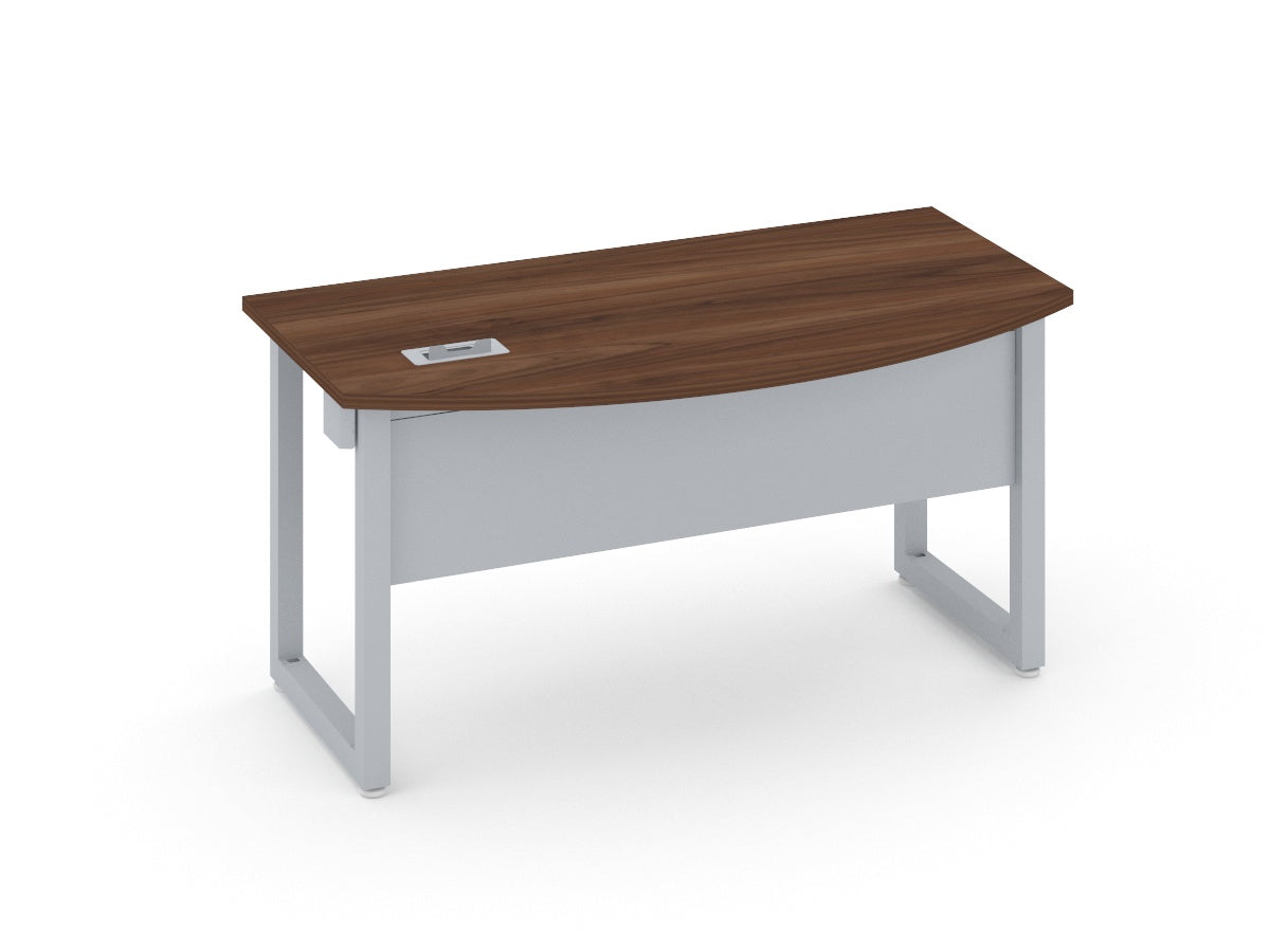 Escritorio individual curvo cubierta de 150x80 en 28mm, base metalica en forma de marco con trabe pasacables incluido.