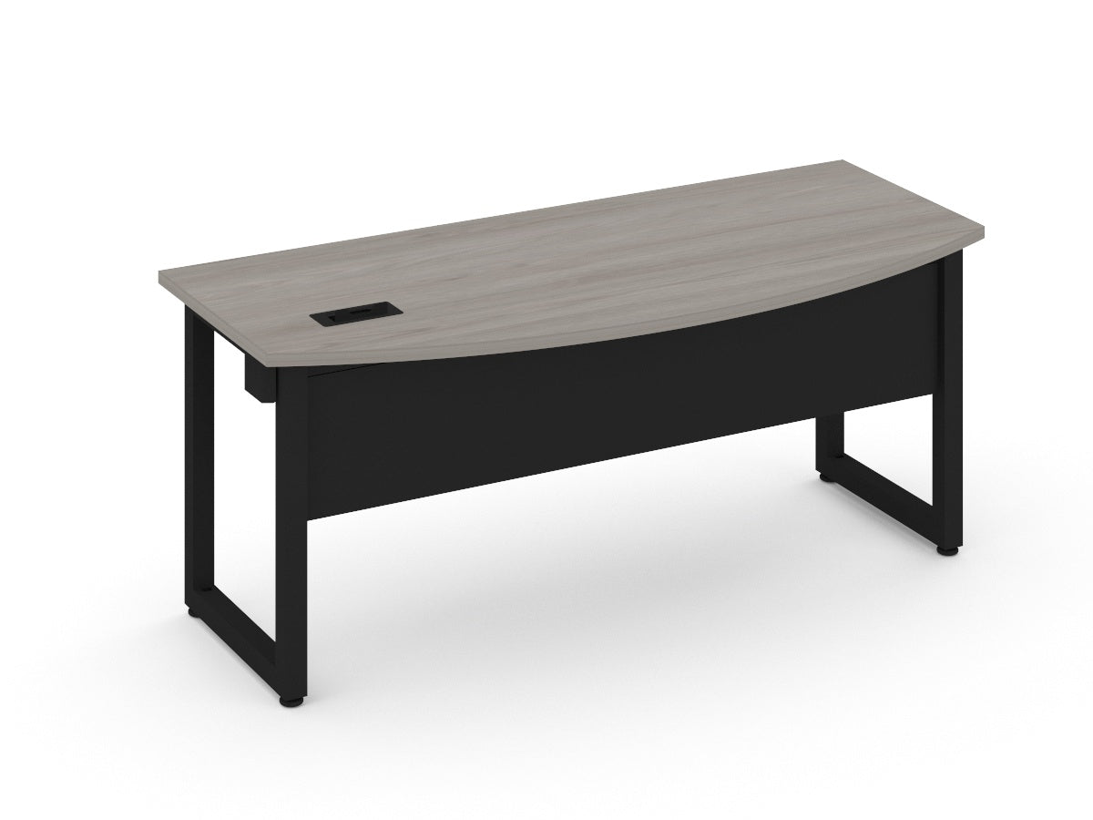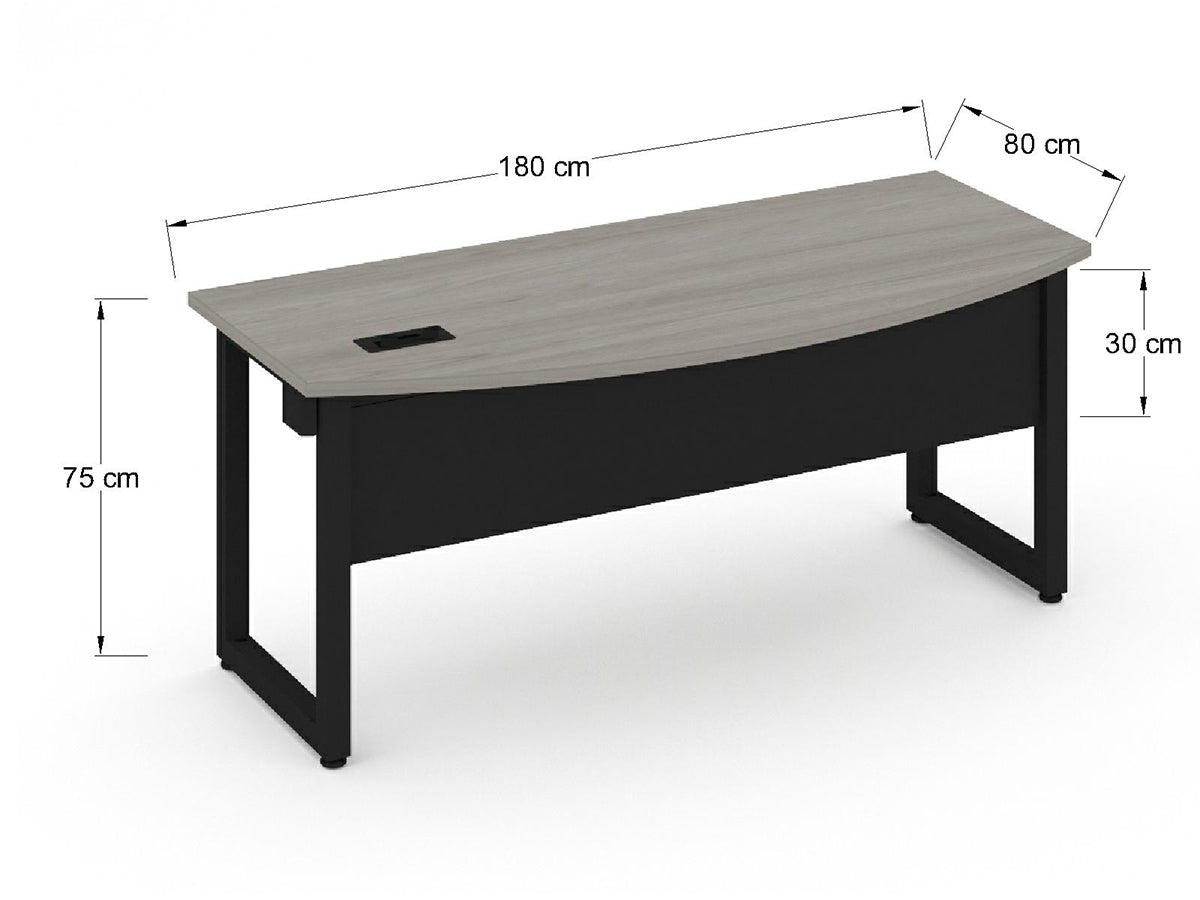 Escritorio individual curvo cubierta de 180x80 en 28mm, base metalica en forma de marco con trabe pasacables incluido.
