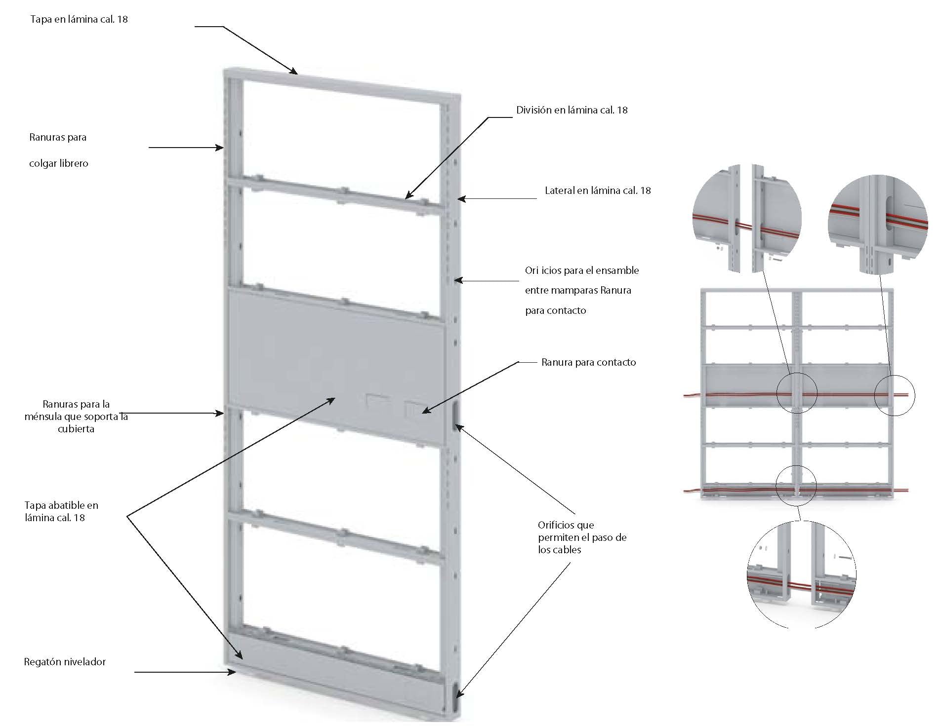 Cada mampara cuenta con ducto registrable en la parte baja de la estructura para el cableado y un ducto mas grande (30cm) en la parte de arriba de la mampara