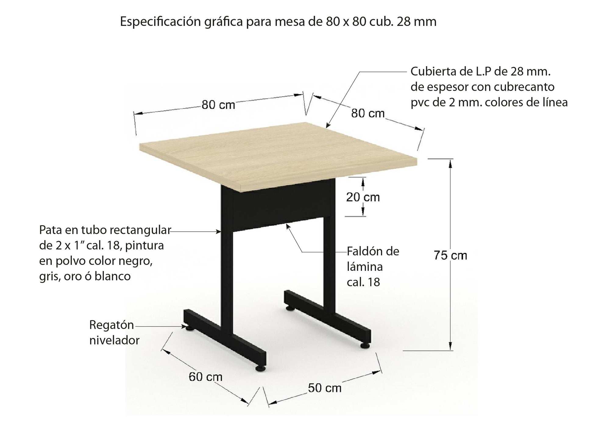 Cubierta para mesa de Restaurante fabricada en Laminado plástico de 19mm ó 28mm, cubrecanto pvc de 80cm X 80cm