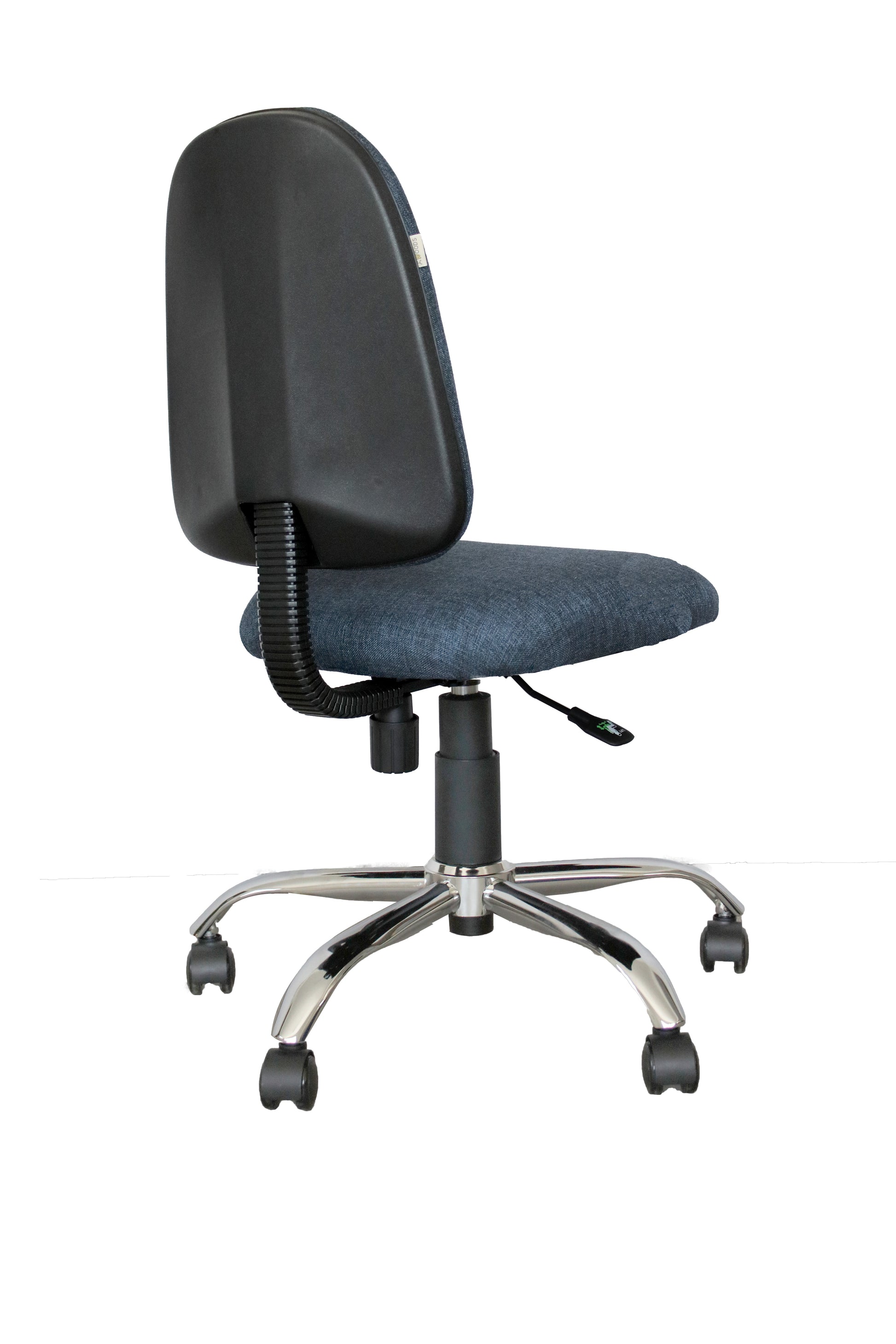 Silla secretarial de respaldo medio, tapizada en piel sintetica o tela, mecanismo secretarial fijo con ajuste de tension, piston de gas, base cromada de 5 puntas con rodajas.