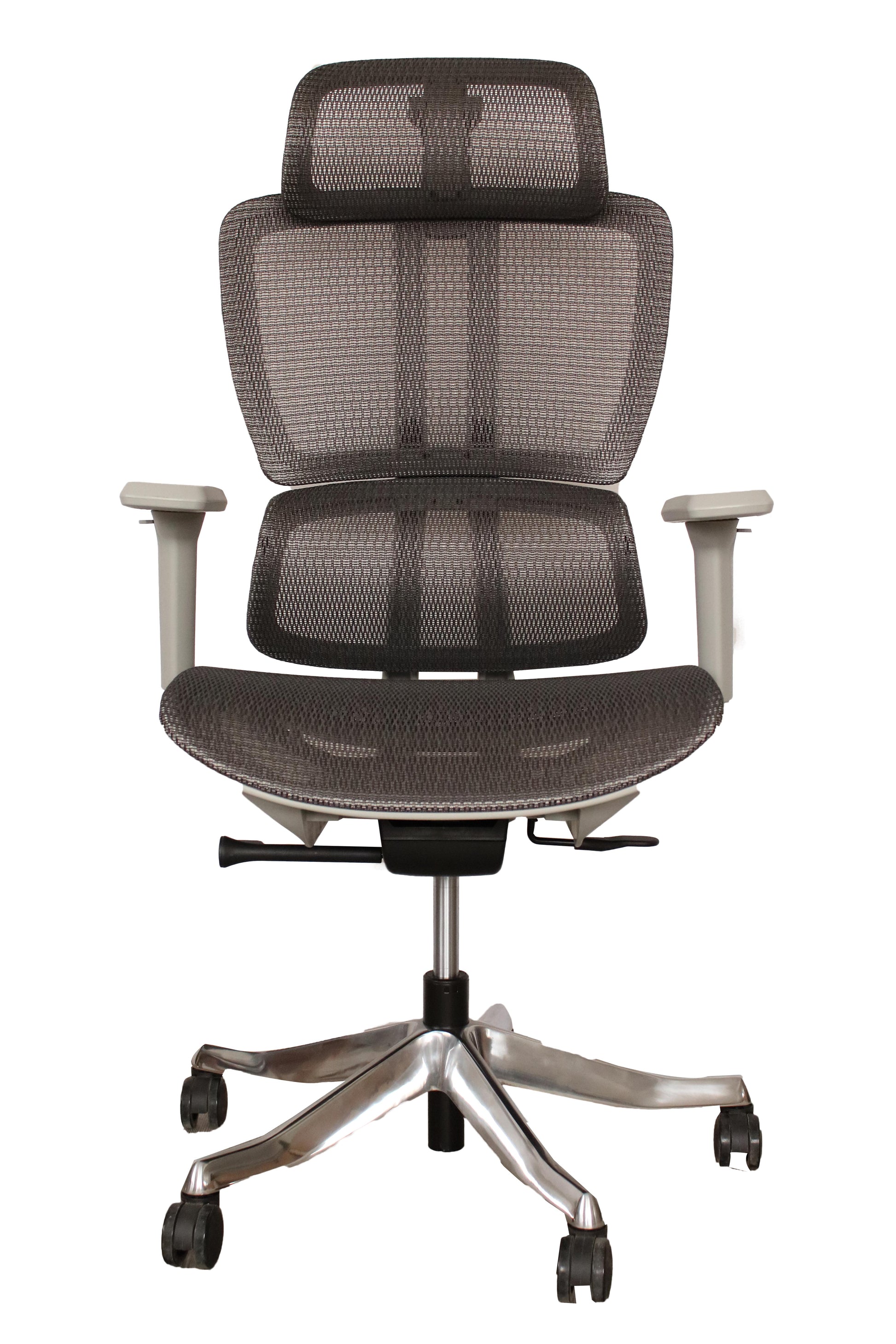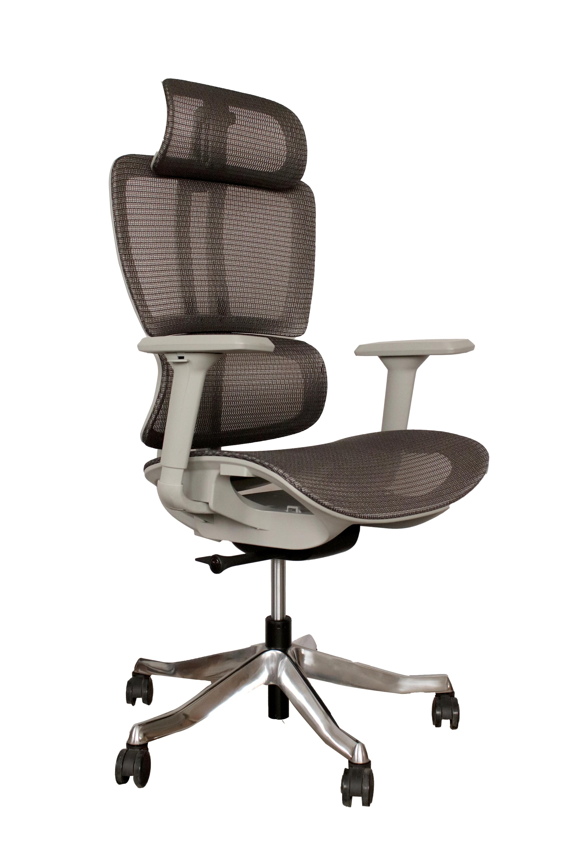 Sillón directivo con cabecera, cuerpo en color gris, cabecera en malla con ajuste de altura, respaldo en malla con soporte lumbar ajustable en altura y profundidad, brazos con ajuste de dos posiciónes, altura y apertura, asiento en malla, mecanismo synchro de dos palancas con ajuste de altura y ajuste de posicionamiento de ángulos para respaldo.