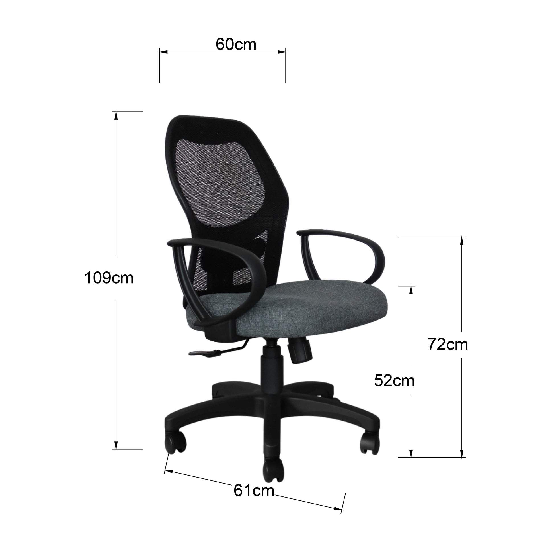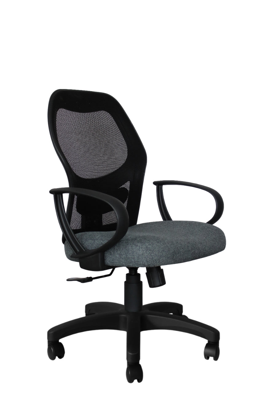 Sillon directivo alto, con brazos fijos, respaldo tapizado en malla, asiento tapizado en piel sintetica o tela, soporte lumbar ajustable, piston de gas, base plastica de 5 puntas con rodajas.