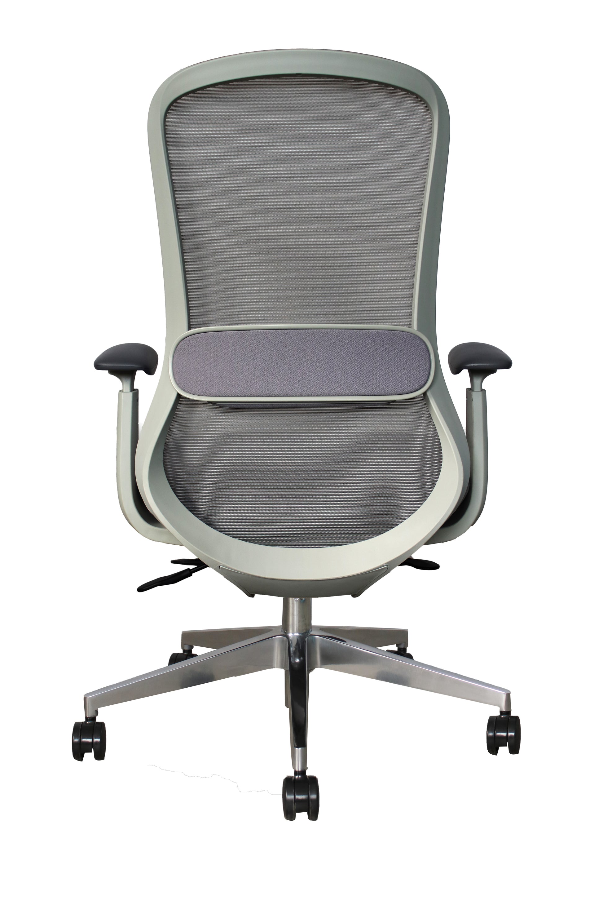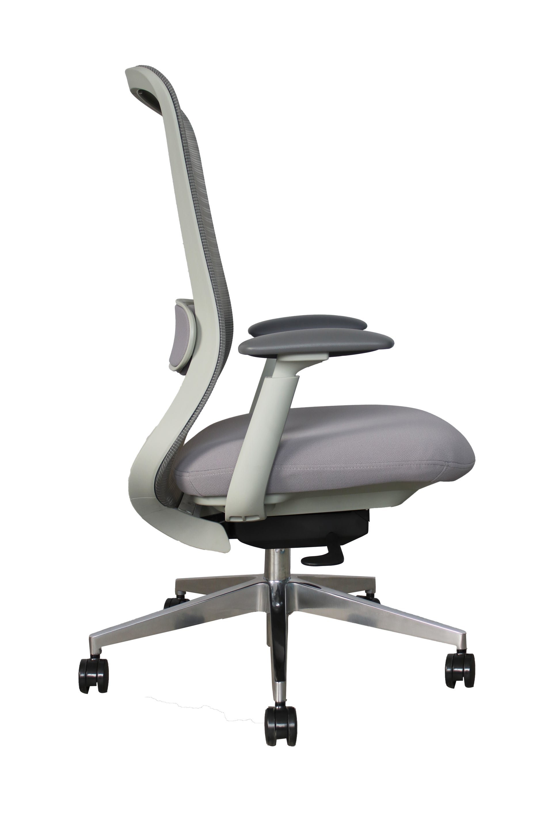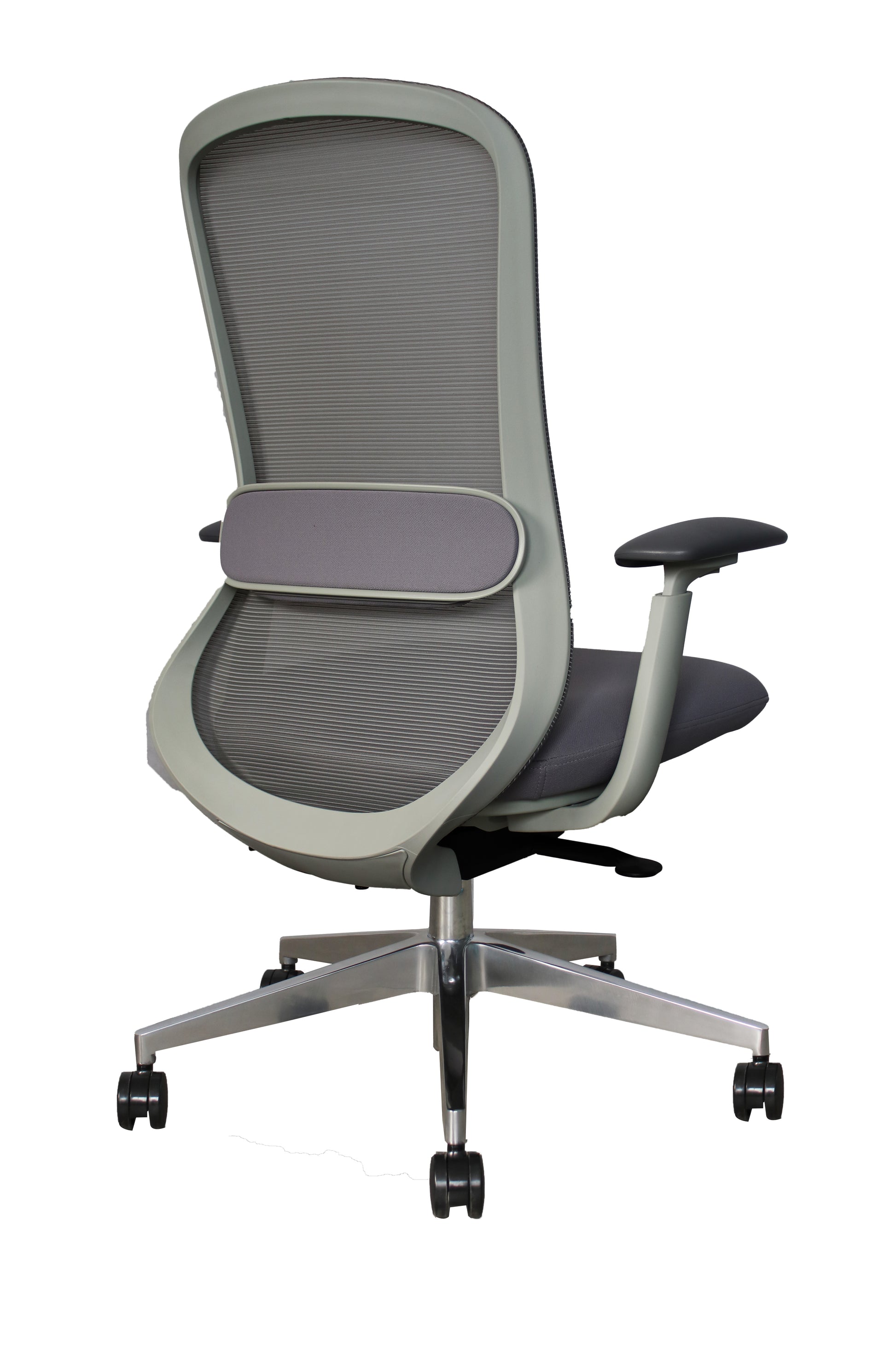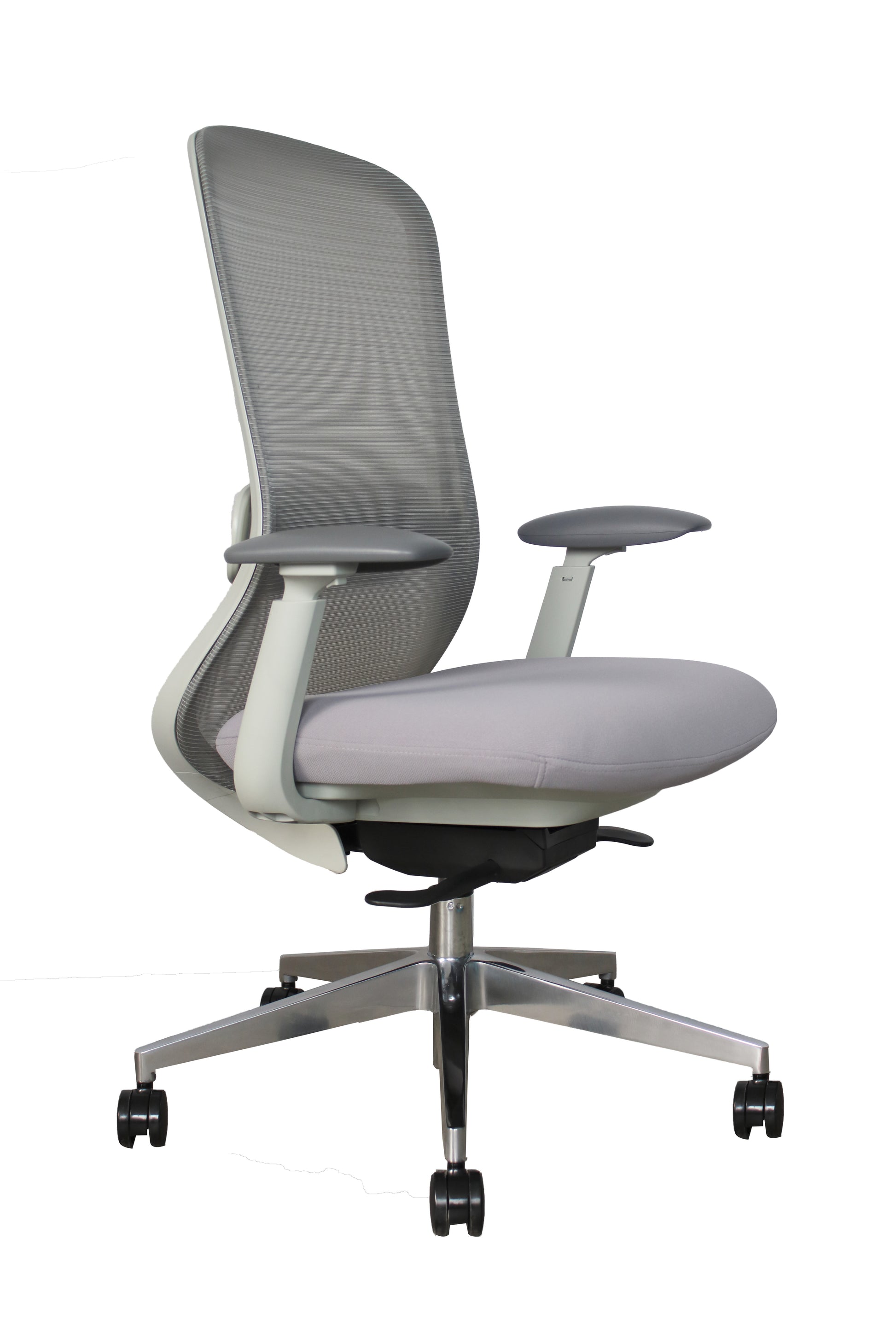 Sillón ejecutivo en estructura color gris, con respaldo médio en malla color gris, con soporte lumbar ajustable, asiento en espuma inyectada tapizado en tela color gris. brazos ajustables 3d. base metálica cromada de 5 puntas, mecanismo slider